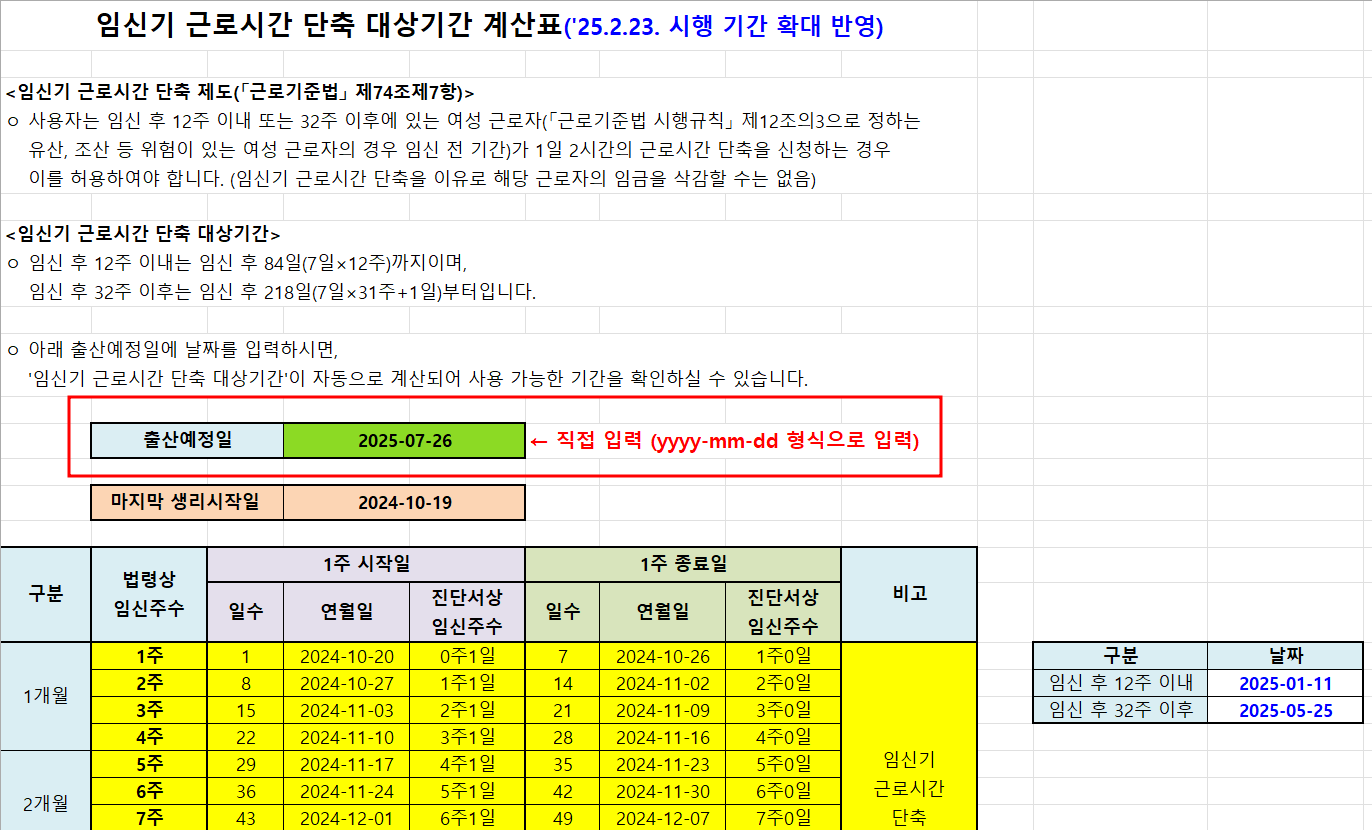 2025 임신기 근로시간 단축 대상기간 계산표는 아래 이미지 누르면 확인가능하다. 엑셀 출산예정일에 입력하면 자동으로 계산되어 사용가능한 기간을 확인할 수 있으니 많은 활용 바래요!!!
