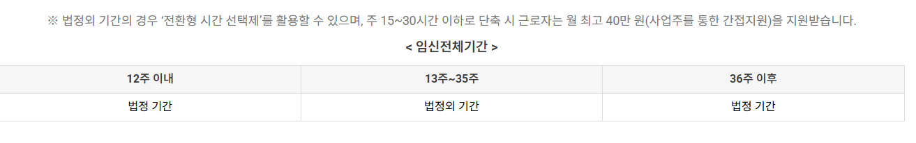 법정 근로시간 단축제도가 적용되지 않는 임신 13주~35주 동안, 근로자가 희망할 경우 주 15시간 이상 30시간 이하로 근무 시간을 줄일 수 있도록 한 제도다.